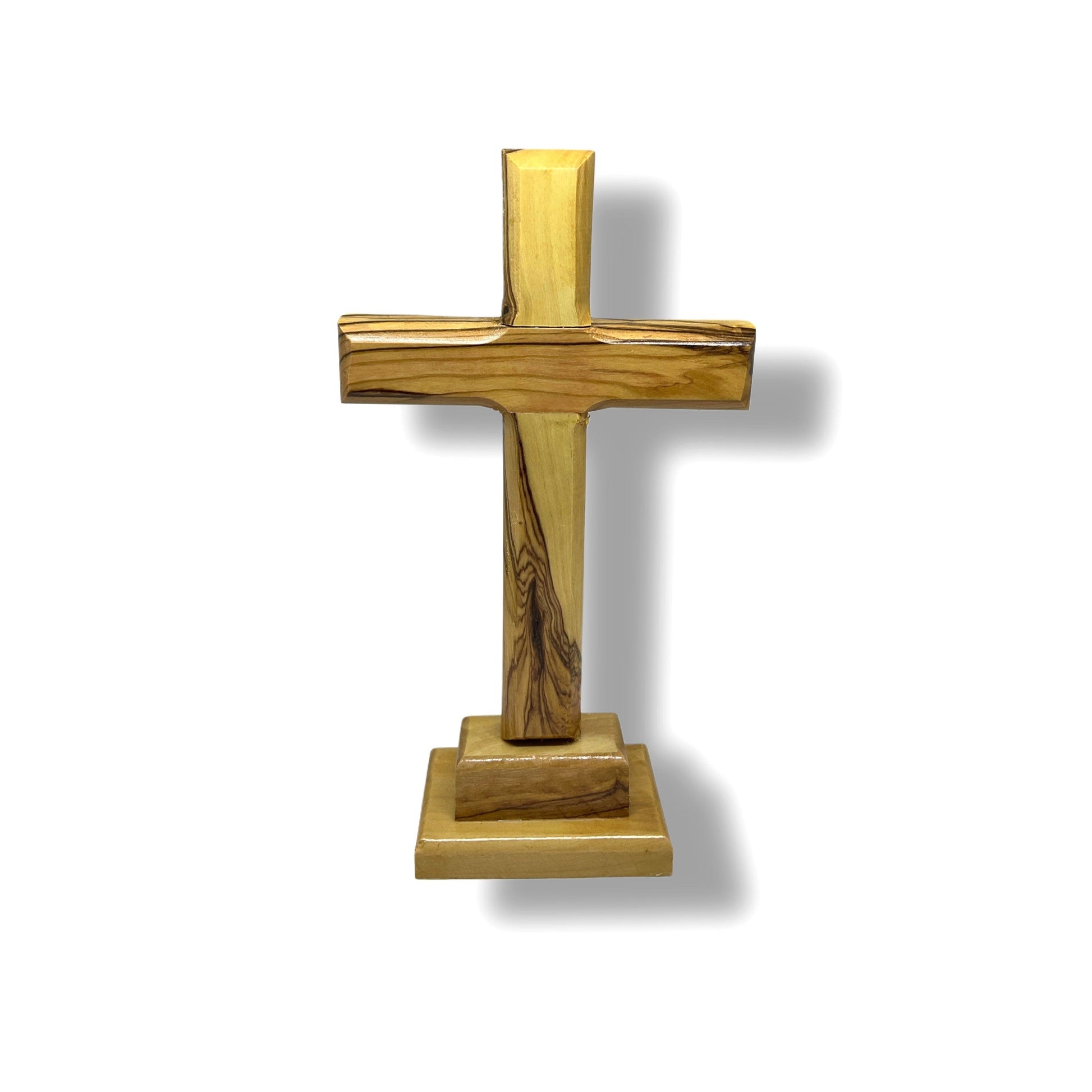 This 16cm piece is handcrafted from genuine olive wood and made in Bethlehem, offering a meaningful link to the Holy Land. Elegantly carved, it features a simple cross mounted on a stand—a quiet yet powerful symbol of faith. Ideal as a thoughtful gift or a devotional piece for the home, it brings a sense of peace and reverence to any space.