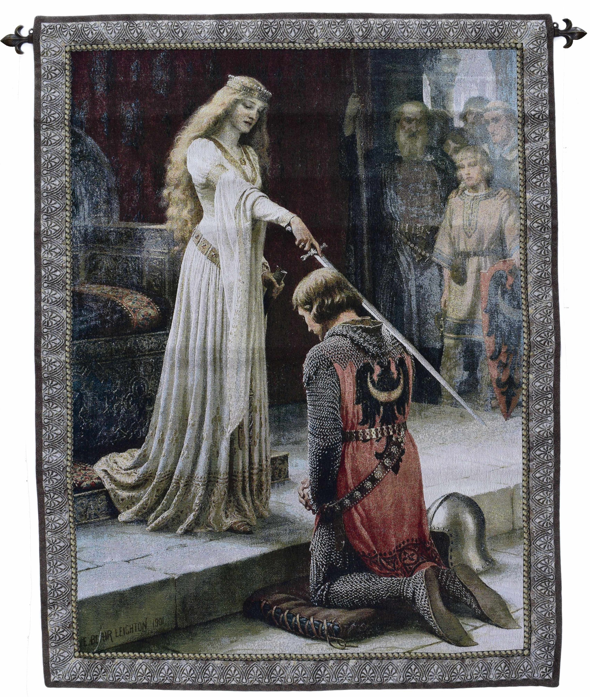 Based on a painting by E. Blair Leighton, this piece reflects the medieval tradition of knighthood. Young nobles began as pages, then squires, before being knighted in a ceremonial accolade, often preceded by a religious vigil. Knights were either bachelors, serving under another's banner, or bannerettes, leading under their own. Accompanied by squires, pages, vassals, and servants, knights played key roles in feudal warfare. After 1100, primogeniture left many knights landless, leading them to join religious-military orders like the Templars, Hospitallers, and Teutonic Knights, especially during the Crusades.