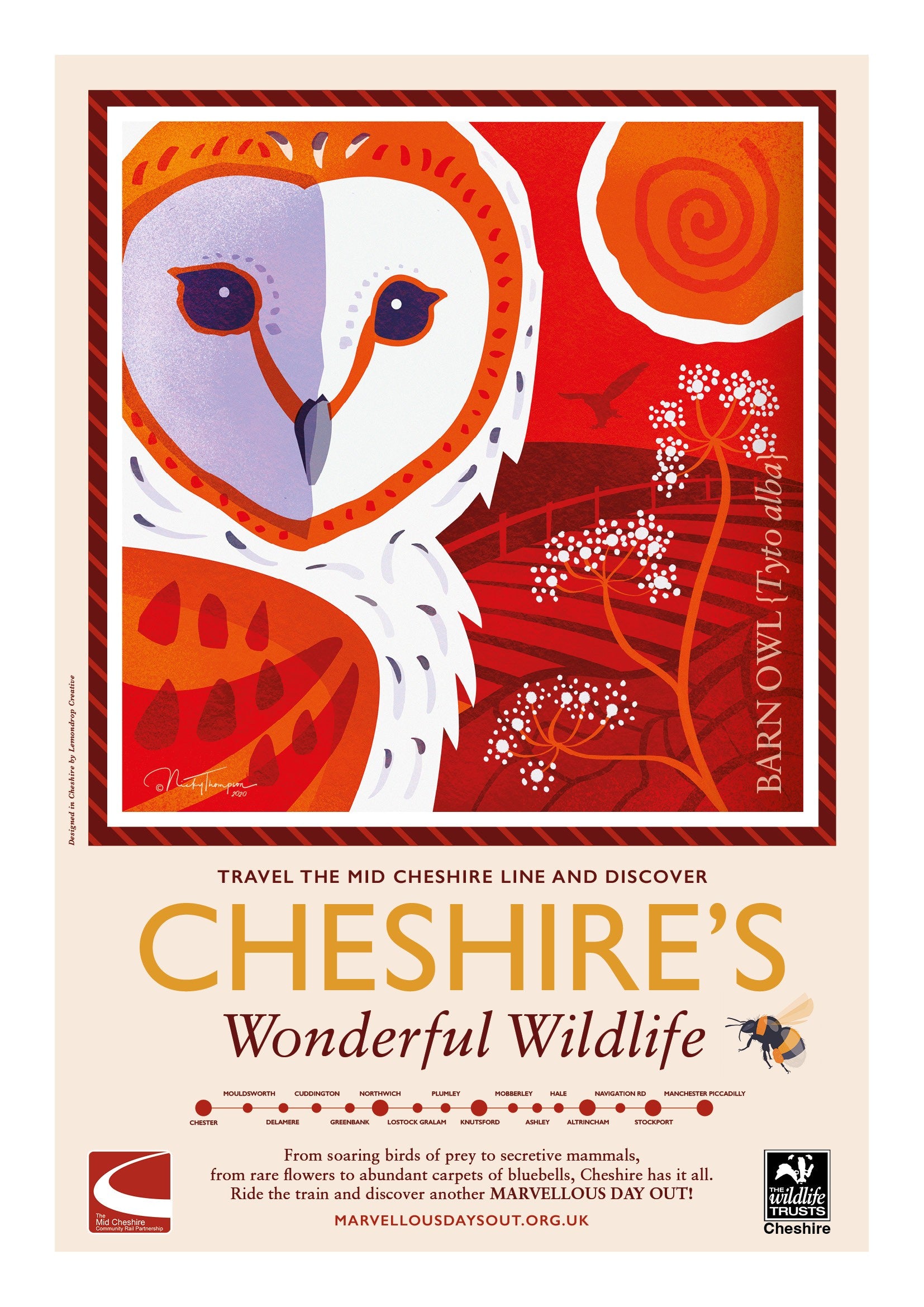 This beautifully illustrated A4 poster by artist Nicky Thompson celebrates the silent and mysterious Barn Owl, a beloved nocturnal bird often gliding over Cheshire’s farmland and meadows. Inspired by classic 1930s railway posters, the artwork combines vintage charm with bold, modern design—part of the Cheshire’s Wonderful Wildlife series highlighting local species along the Mid-Cheshire rail line. A vibrant and timeless piece, perfect for wildlife enthusiasts and fans of retro travel art alike.
