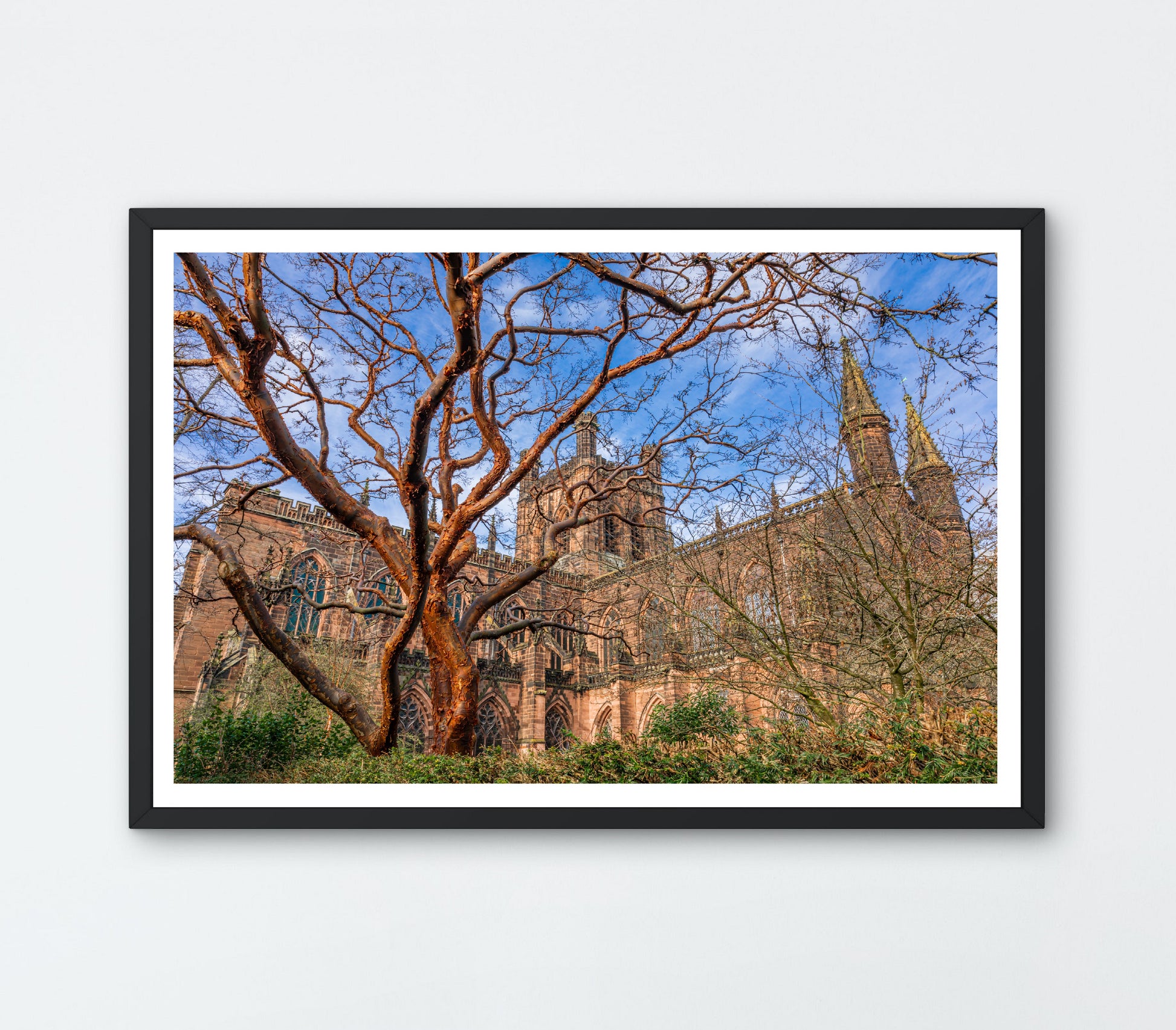 This giclée print beautifully captures the majestic Chester Cathedral framed by the distinctive Paperbark Maple tree. The Cathedral’s rich Gothic architecture—with its intricate stone carvings and soaring spires—forms a stunning backdrop, while the tree’s unique peeling bark and vibrant foliage provide a natural contrast that highlights the harmony between history and nature in Chester.