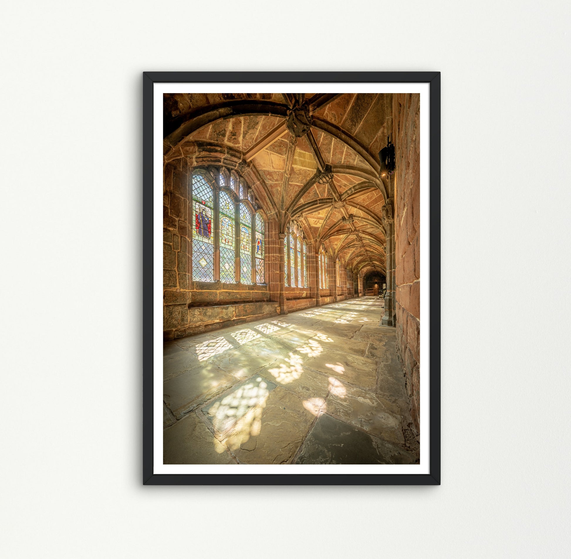 This giclée print captures the serene beauty of the cloisters at Chester Cathedral, bathed in a quiet moment of light. Sunlight streams through a stained glass window, casting vibrant patterns across the worn stone floor—illuminating both the architectural elegance and the spiritual stillness of this sacred space.