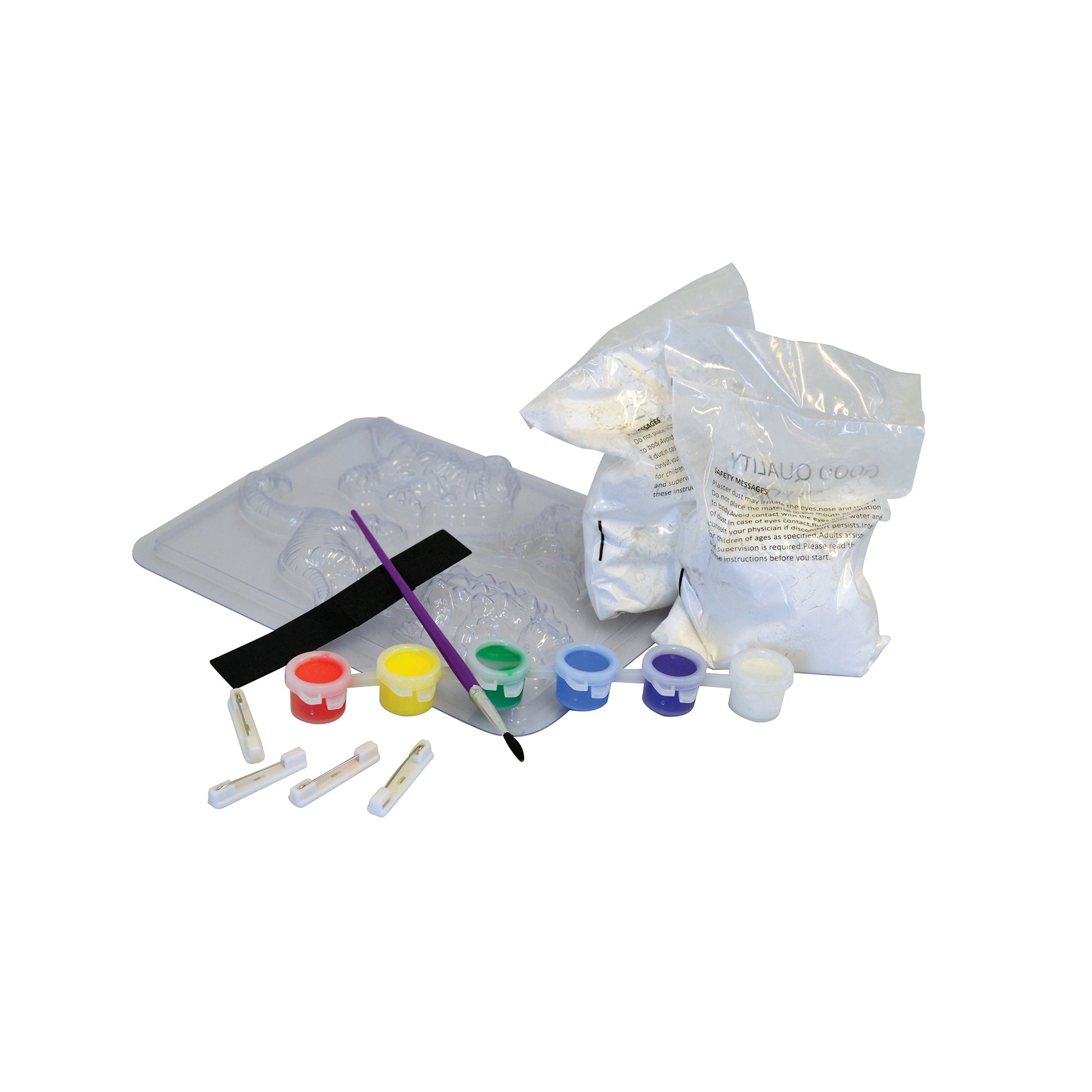 Contents - 1 moulding tray, 2 bags of plaster powder, 1 magnet strip, 1 set of six paints, 1 bag of glitter, gold coloured thread, 6 badge pins, 1 paintbrush and detailed instructions.