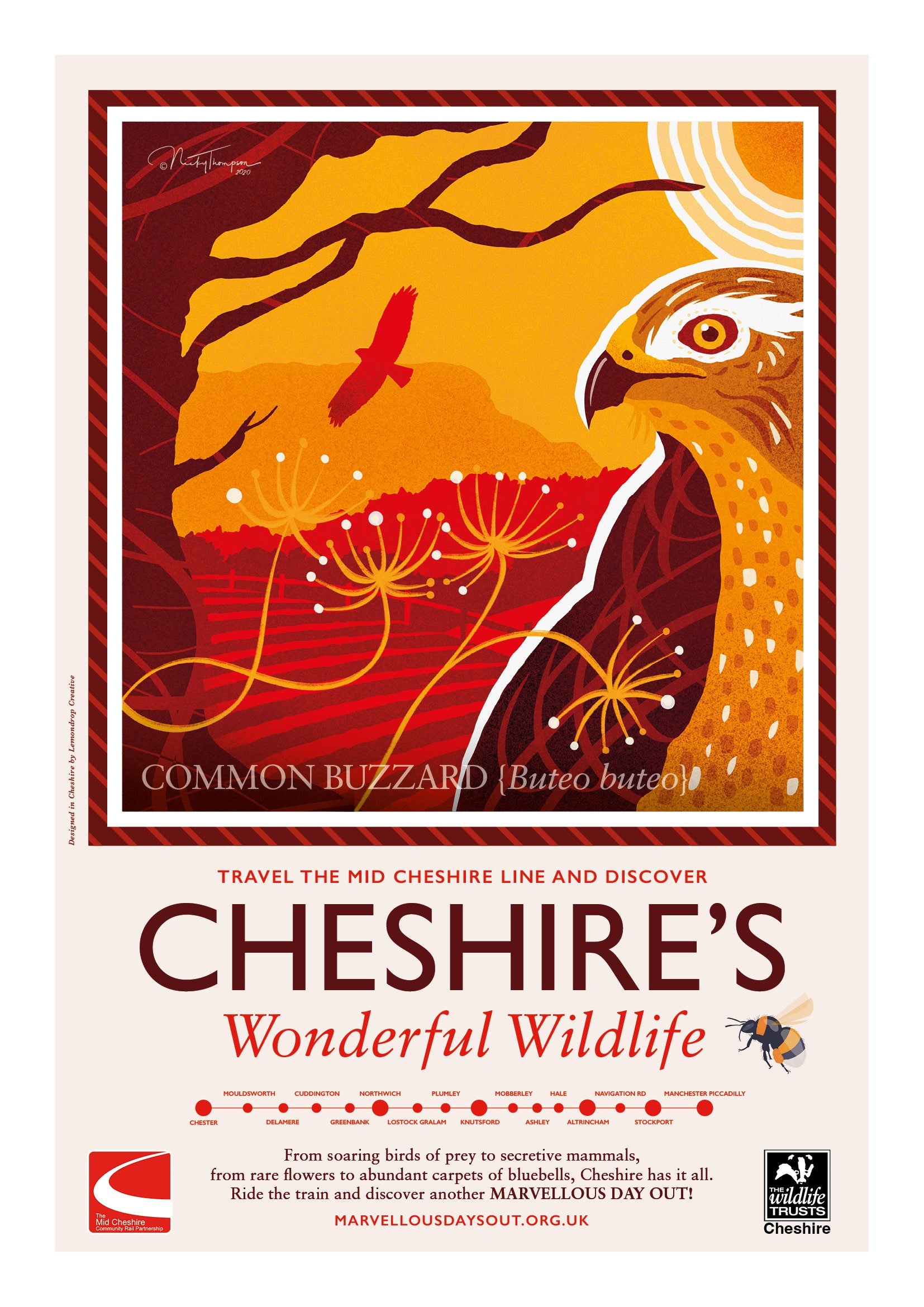 This beautifully illustrated A4 poster by artist Nicky Thompson celebrates the soaring Common Buzzard, a widespread bird of prey often seen circling the skies over Cheshire’s woodlands and open countryside. Inspired by classic 1930s railway posters, the artwork combines vintage charm with bold, modern design—part of the Cheshire’s Wonderful Wildlife series highlighting local species along the Mid-Cheshire rail line. A vibrant and timeless piece, perfect for wildlife enthusiasts and fans of retro travel art alike.