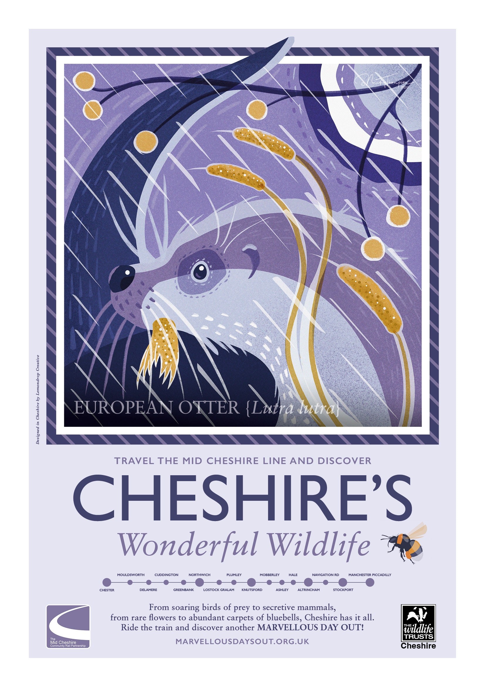 This beautifully illustrated A4 poster by artist Nicky Thompson celebrates the playful and secretive European Otter, a native of Cheshire’s rivers, canals, and wetlands. Inspired by classic 1930s railway posters, the artwork combines vintage charm with bold, modern design—part of the Cheshire’s Wonderful Wildlife series highlighting local species along the Mid-Cheshire rail line. A vibrant and timeless piece, perfect for wildlife enthusiasts and fans of retro travel art alike.