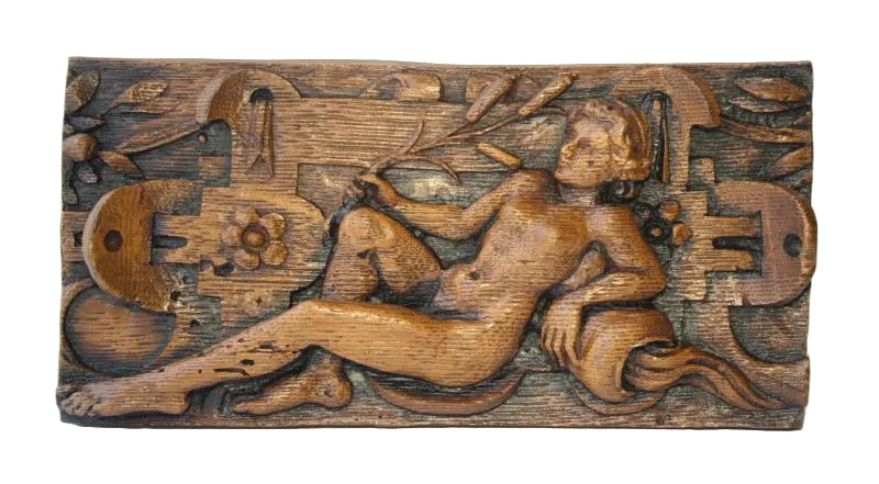 The carving depicts Eve seated, holding bulrushes, in a classic Romanesque style. Along with its paired counterpart of Adam, it references the rivers Tigris and Euphrates as symbols of the giver of life. Originally carved in Antwerp, Belgium (c.1559) for a local church, these figures eventually became part of Carlisle Cathedral’s collection. The reproduction faithfully captures the intricate detail and craftsmanship of the original carving.