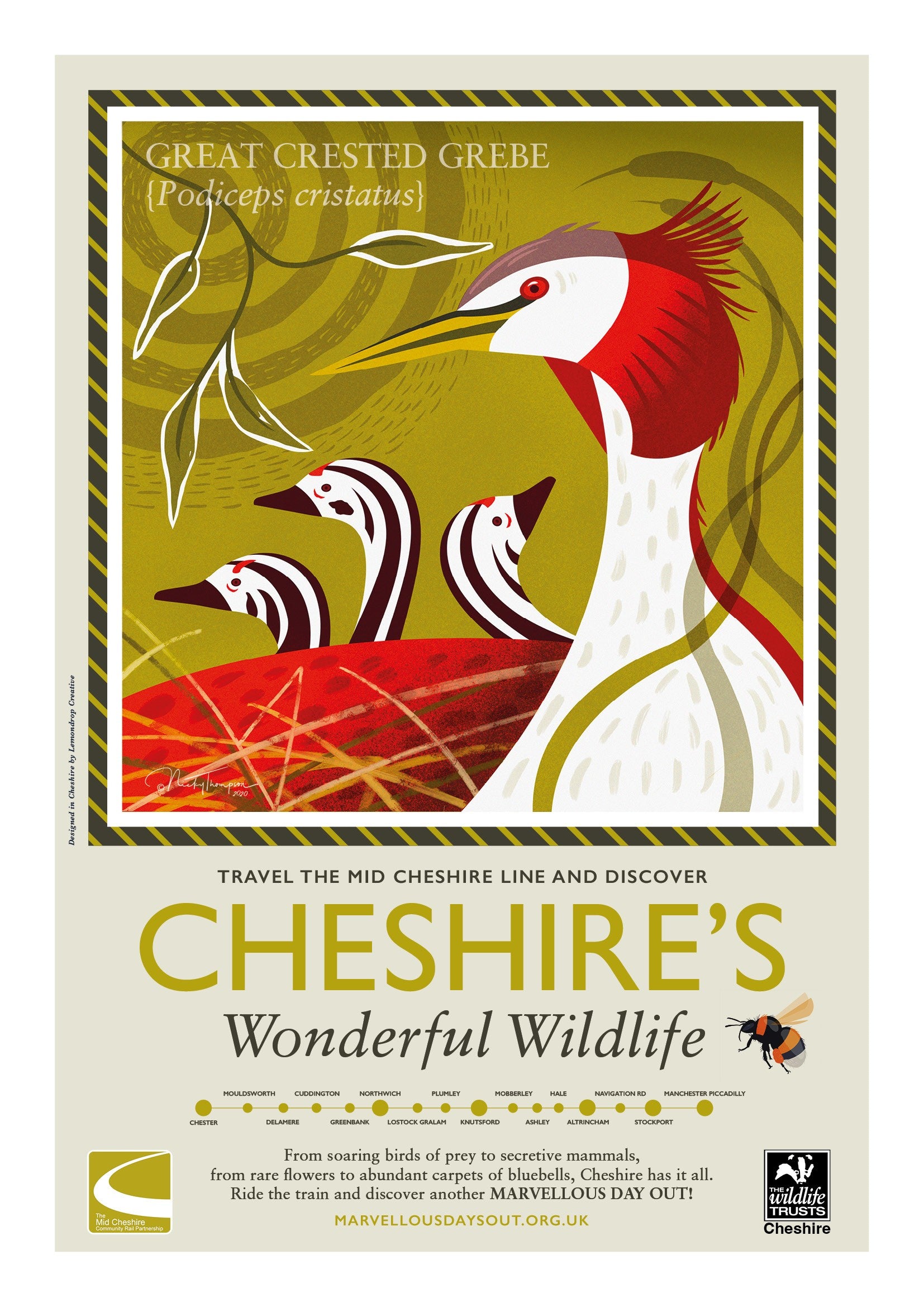This beautifully illustrated A4 poster by artist Nicky Thompson celebrates the elegant Great Crested Grebe, a striking waterbird found on Cheshire’s lakes and wetlands. Inspired by classic 1930s railway posters, the artwork combines vintage charm with bold, modern design—part of the Cheshire’s Wonderful Wildlife series highlighting local species along the Mid-Cheshire rail line. A vibrant and timeless piece, perfect for wildlife enthusiasts and fans of retro travel art alike.