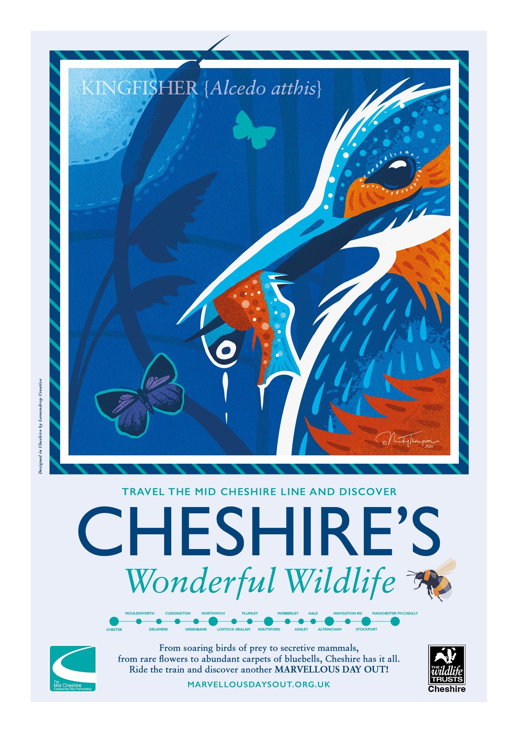 This beautifully illustrated A4 poster by artist Nicky Thompson celebrates the dazzling Kingfisher, known for its vibrant blue and orange plumage and swift dives along Cheshire’s rivers and streams. Inspired by classic 1930s railway posters, the artwork combines vintage charm with bold, modern design—part of the Cheshire’s Wonderful Wildlife series highlighting local species along the Mid-Cheshire rail line. A vibrant and timeless piece, perfect for wildlife enthusiasts and fans of retro travel art alike.