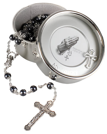 This elegant imitation pearl rosary comes beautifully presented in a silver-coloured decorative metal photo box, perfect for both prayer and display. The box features a space to insert your own photo, adding a personal touch to this meaningful keepsake. With its timeless design and spiritual significance, it makes a thoughtful gift for a loved one or a special addition to your own collection.