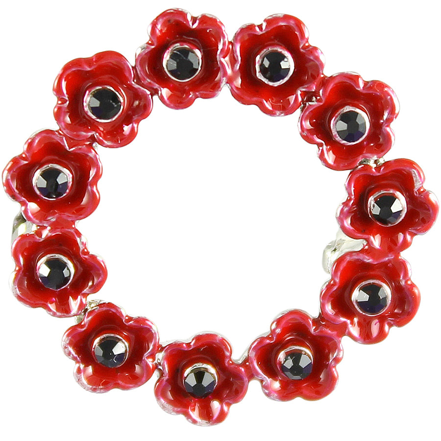 This charming 25mm poppy brooch features a delicate wreath of hand-finished, vibrant red enamel poppies. Each poppy is adorned with a sparkling jet crystal, adding depth and elegance to this unique accessory. Perfect for your lapel, coat, or jacket, it’s a timeless piece that beautifully combines fashion with a meaningful symbol of remembrance and respect.