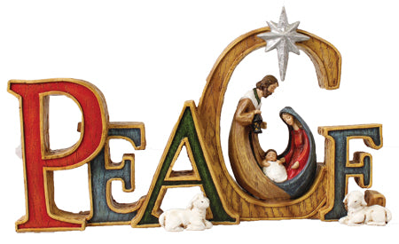 A graceful blend of word art and sacred symbolism, this beautifully crafted Resin Nativity Scene spells out the word “PEACE”, with the Holy Family nestled within the letter 'C' - a powerful expression of the message at the heart of Christmas.