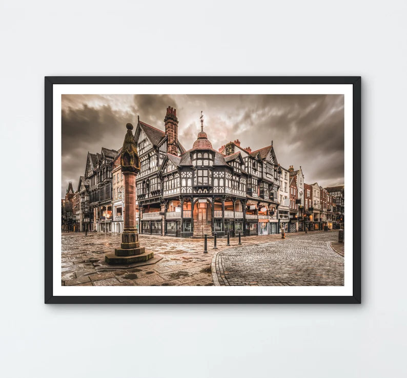 This giclée print captures a timeless view of The Cross, situated at the heart of Chester’s historic city centre. Framed by the city’s signature black-and-white timbered architecture, The Cross has long served as a central meeting point and a vibrant focal point for civic life.