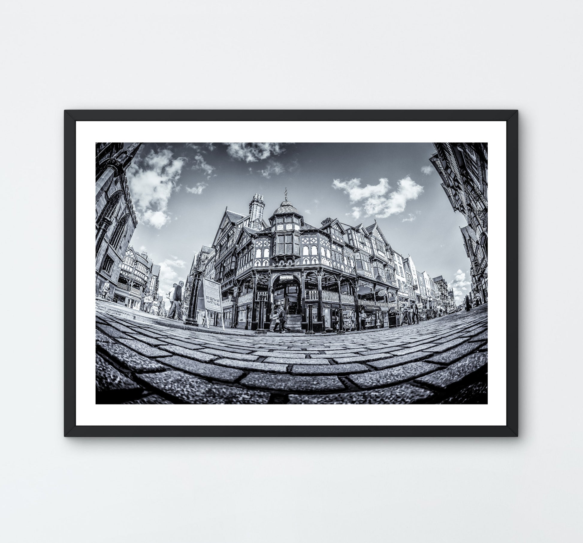 This distinctive giclée print offers a ground-level, fisheye perspective of one of Chester’s most historically rich areas—The Cross. Departing from more conventional views of the city, this composition captures the cobbled street and surrounding architecture from a unique, immersive angle, placing the viewer directly within the scene.